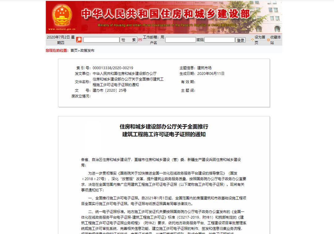 住房和城鄉(xiāng)建設部官網(wǎng)近日發(fā)布通知,為深化“放管服”改革,提升建筑業(yè)政務服務質(zhì)量,按照國務院辦公廳電子政務辦公室要求,住房和城鄉(xiāng)建設部決定自2021年1月1日起,在全國范圍內(nèi)推廣應用建筑工程施工許可證電子證照。
