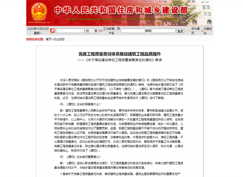 為深入貫徹落實《國務院辦公廳關于促進建筑業(yè)持續(xù)健康發(fā)展的意見》(國辦發(fā)〔2017〕19號)和《國務院辦公廳轉(zhuǎn)發(fā)住房城鄉(xiāng)建設部關于完善質(zhì)量保障體系提升建筑工程品質(zhì)指導意見的通知》(國辦函〔2019〕92號)精神,住房和城鄉(xiāng)建設部印發(fā)了《關于落實建設單位工程質(zhì)量首要責任的通知》(以下簡稱《通知》)。